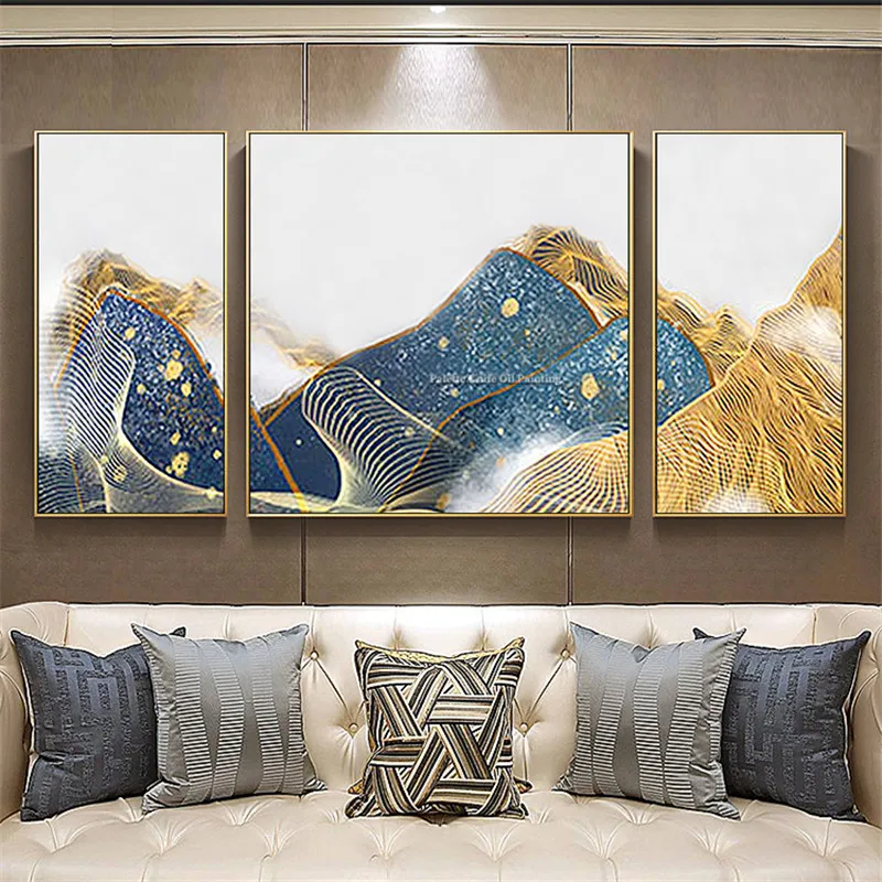 3 pieces abstract blue gold mountain painting on Canvas acrylic painting Wall art Pictures for living room quadros caudros decor
